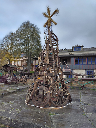 El artista Rubén Prieto, afincado en Grandas de Salime, ha creado para el Museo una nueva instalación artística, una reinterpretación muy especial de un árbol navideño. Ruedas de carro, restos de maderas o una colección de despertadores del propio artista se integran en un árbol único que el público puede ver esta Navidad en el eira del Molino del Museo.